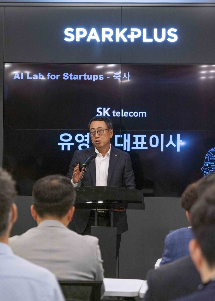 ▲하나금융그룹과 SK텔레콤이 AI 초협력을 가속화해 금융 혁신과 신성장 동력 발굴, ESG 경영 협력 등에서 성과를 내고 있다. 유영상 SK텔레콤 대표가 AI 스타트업 랩 개소식에서 축사를 하고 있다. [사진=SK텔레콤] |