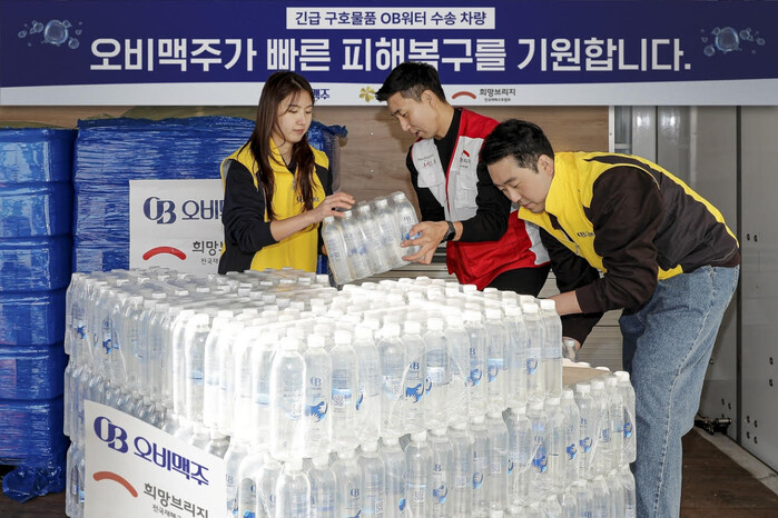 오비맥주는 2016년부터 희망브리지 전국재해구호협회에 생수 등 긴급 구호물품을 상시 비축하는 체계를 구축해 운영하고 있다.