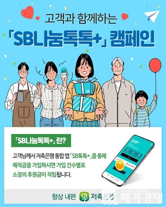 저축은행중앙회(박재식)는 지난 29일 저축은행 오픈뱅킹 서비스 출시를 기념해 SB톡톡플러스로 앱 다운로드 및 신규 예·적금을 가입하면 후원금이 적립되는 ‘SB나눔톡톡플러스 캠페인’을 진행한다고 4일 밝혔다.
