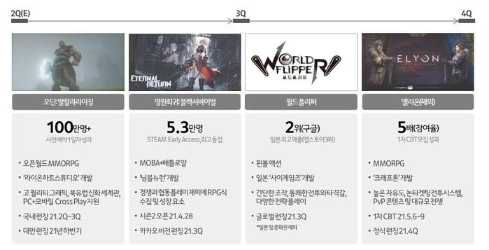사전예약 첫 날 100만 명 이상이 몰린 ‘오딘: 발할라 라이징’이 2분기 말 출시 예정이며, ‘월드플리퍼’, '영원회귀: 블랙서바이벌', ‘소울 아티팩트(가칭)’, ‘가디스 오더’ 등을 국내 시장에 순차적으로 출시할 계획이다.
