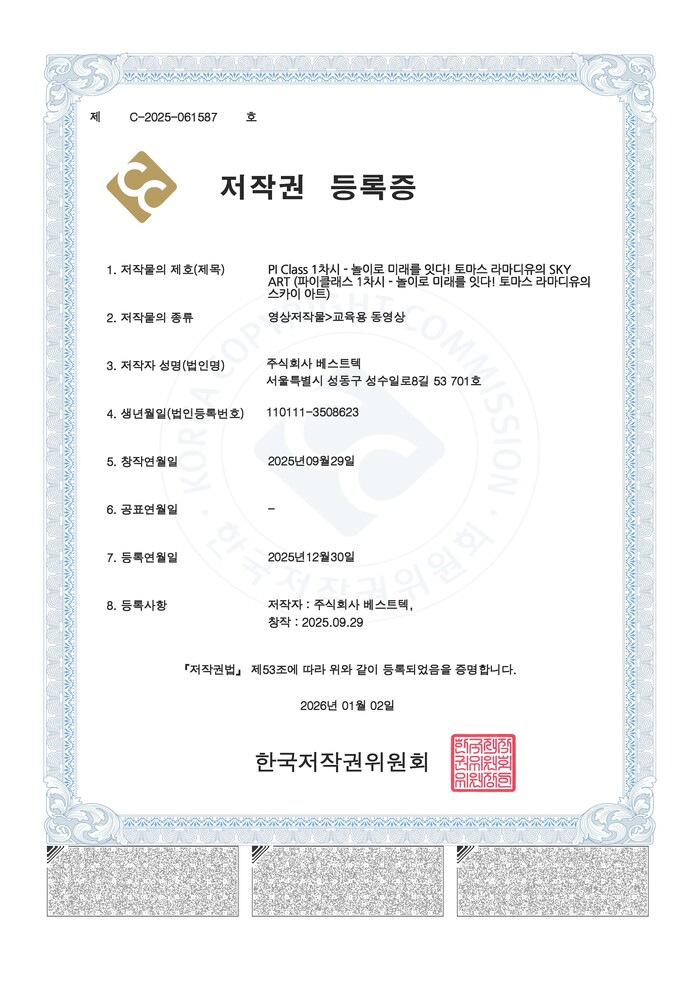 서우승 베스트텍 대표는 “이번 저작권 등록은 파이클래스가 단순 프로그램이 아닌, 베스트텍이 축적해온 교육 철학과 콘텐츠 설계 역량이 집약된 독자적 교육 자산임을 공식적으로 인정받은 결과”라며 “향후 공교육, 돌봄, 지자체 교육 사업은 물론 글로벌 교육 협력 사업까지 확장 가능한 기반을 갖추게 됐다”고 말했다.