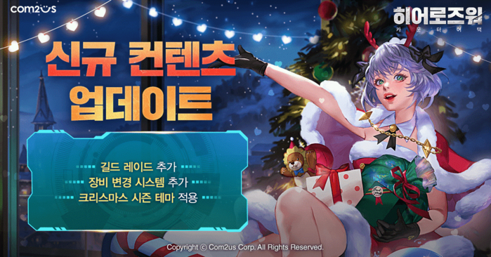 이 밖에도 ‘히어로즈워’는 오는 크리스마스를 기념해 게임 내 시즌 테마를 적용한 다채로운 즐길거리와 특별 이벤트를 마련해 게임의 재미를 더할 예정이다.