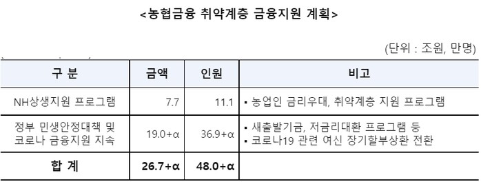농협금융이 취약계층을 위해 27조원 이상의 대대적인 금융지원에 나선다. 급격한 금리인상에 따른 소상공인 등 취약차주 고통 분담차원으로 청년, 농업인 등 금융 소외계층을 위한 종합적인 지원을 실시한다. 코로나19 금융지원 대체 프로그램도 준비한다.