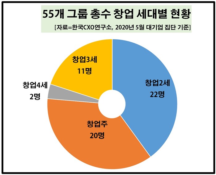 경영 세대별로 살펴보면 창업 2세 경영자가 22명으로 가장 많았고, 창업 1세대도 20명이나 됐다. 3세 및 4세 경영자는 각각 11명, 2명으로 파악됐다.