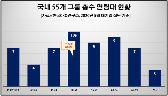 단일 출생년도 중에서는 1953년생이 6명으로 가장 많았다. 신창재 교보생명 회장, 박성수 이랜드그룹 회장, 우오현 SM그룹 회장 등이 올해 69세 동갑내기 그룹 총수에 속했다.