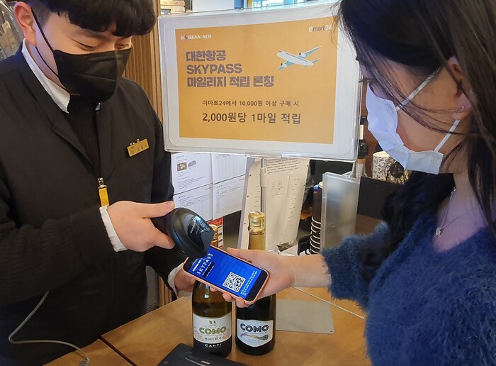 마일리지를 적립하기 위해서는 이마트24 매장에서 1만 원 이상의 상품을 구매하면서 대한항공 앱에 있는 스카이패스(SKYPASS) QR코드를 먼저 스캔한 뒤 결제하면 된다.