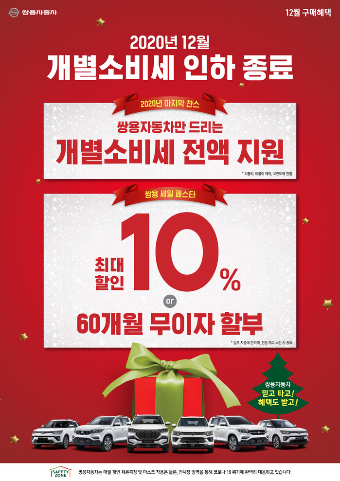 일찍 구매할수록 이득이 되는 ‘크리스마스 기프트 나눔 이벤트’ 프로그램도 시행된다. 티볼리(에어 포함), 코란도, 렉스턴 스포츠&칸 구매 고객은 구매일에 따라 ▲21일까지 20만원 ▲월말까지 10만원 할인 혜택이 주어진다.