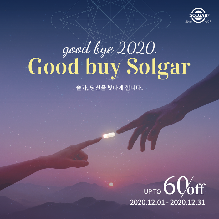 [메가경제=최낙형 기자] 프리미엄 비타민 전문 브랜드 한국솔가는 오는 31일까지 솔가몰에서 연말 맞이 할인 프로모션인 ‘Good bye 2020, Good buy Solgar’를 진행한다고 2일 밝혔다.