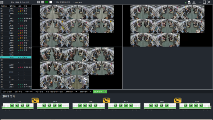 | ▲부산교통공사가 LTE-R 기반 ‘멀티스트림 영상 압축·패키징’ 신기술을 전국 도시철도 최초로 도입해 ‘실시간 관제’ 시스템을 구축했다.(부산도시철도 2호선 객실 CCTV 영상 송출 화면) |