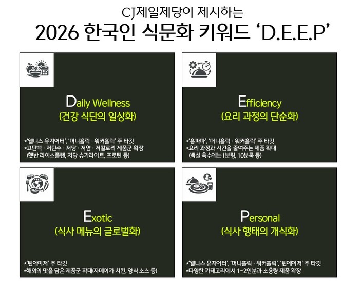 CJ제일제당은 10대부터 70대까지 2,000명을 대상으로 식(食) 라이프스타일 설문조사와 일부 가구 방문 관찰을 실시해 한국인 식생활의 현주소를 분석했다. 조사 결과를 바탕으로 도출한 식문화 키워드 ‘딥(D.E.E.P)’은 ▲건강 식단의 일상화(Daily Wellness) ▲요리 과정의 단순화(Efficiency) ▲식사 메뉴의 글로벌화(Exotic) ▲식사 행태의 개식화(個食化·Personal)를 의미한다.