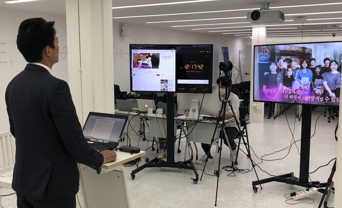 ▲ 21일 서울 성동구 소재 두드림스페이스에서 유튜브 생중계로 진행된 신한SOHO사관학교 13기 개강식 모습. [사진= 신한은행 제공] |