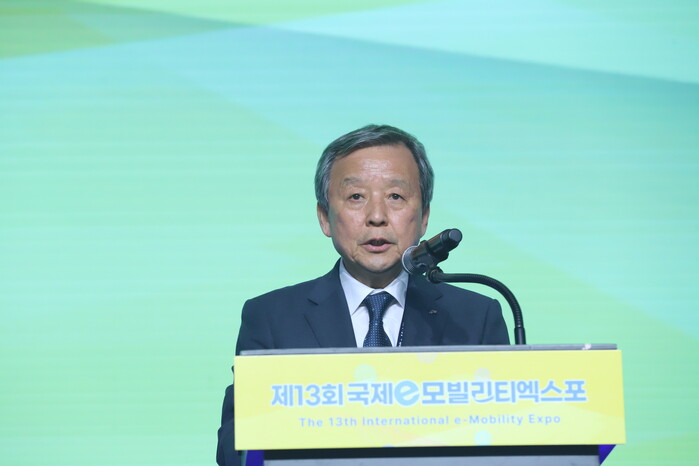 김대환 세계전기차협의회장은 27일 제주 신화월드에서 열린 제13회 국제 e-모빌리티 엑스포 폐막식에서 ‘평양 국제 전기차 엑스포’ 개최 협력 제안문을 낭독했다.