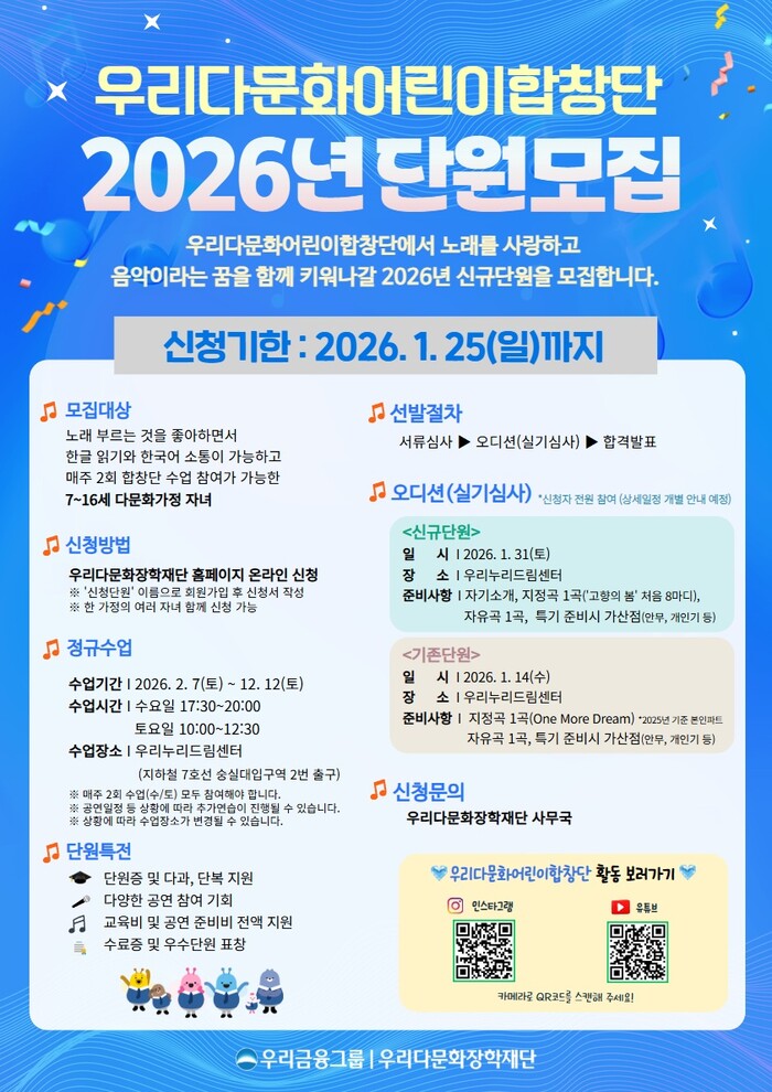 [메가경제=이상원 기자] 우리금융그룹 우리다문화장학재단은 ‘우리다문화어린이합창단’의 2026년도 신규 단원을 공개 모집한다고 15일 밝혔다.