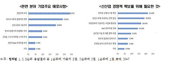 업종별 협회 정책담당자들은 한국 7대 신산업에서 소속 기업들이 느끼는 가장 큰 애로사항으로 ▲전문인력 부족(28.6%) ▲신산업분야 과도한 규제 및 불합리한 관행(23.8%) ▲선진국과의 기술격차(19.1%) 등을 지적했다.