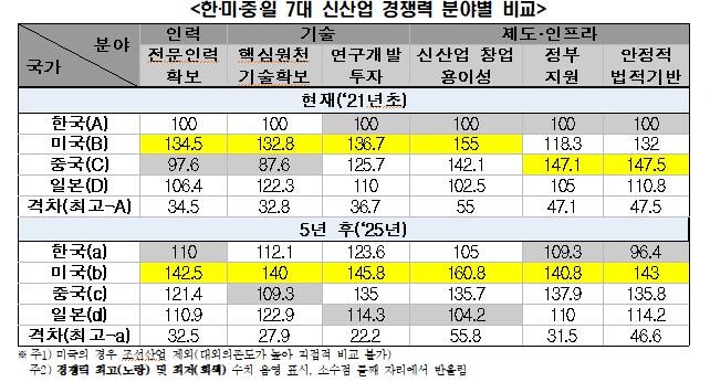 특히 전문인력 확보 항목에서는 현재 한국(100)이 중국(97.6)보다는 근소하게 앞섰지만, 일본(106.4)과 미국(134.5)과 비교해 경쟁력 격차가 크게 나타났다.