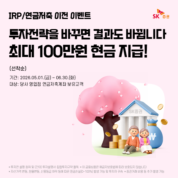 이번 이벤트는 타사 개인형퇴직연금(IRP) 또는 연금저축계좌를 SK증권 연금저축으로 이전하는 고객을 대상으로 하며, 순이전 금액에 따라 차등화된 현금 지급 혜택을 제공한다.