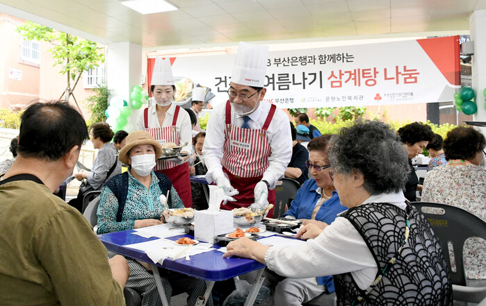 이날 방성빈 은행장은 부산은행 지역봉사단과 함께 문현노인복지관을 직접 방문해 지역 어르신들을 찾아뵙고 삼계탕을 대접해 지역 온정 나눔에 힘을 보탰다.