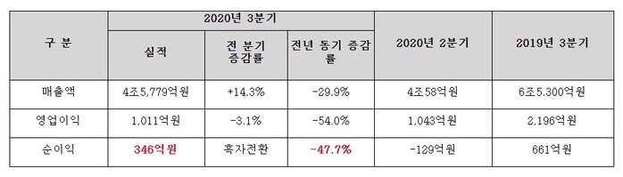 매출은 전년 동기 대비 29.9%, 영업이익은 54.0% 하락했다. 당기순이익은 346억원으로, 같은 기간 47.7% 감소했다.