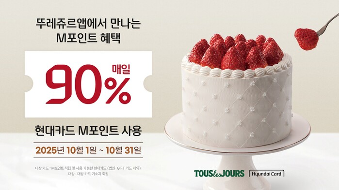 이번 프로모션은 뚜레쥬르 공식 앱에서 현대카드로 결제 시 구매 금액의 최대 90%까지 M포인트를 사용할 수 있는 이벤트다. M포인트 적립 및 사용 가능한 현대카드 기소지 회원이라면 누구나 참여 가능하며, 결제 금액의 제한 없이 카드 이용객이 보유한 잔여 M포인트 안에서 자유롭게 사용이 가능하다. 단, 간편결제 서비스, 쿠폰 및 타 제휴 카드 혜택과는 중복 적용되지 않는다.