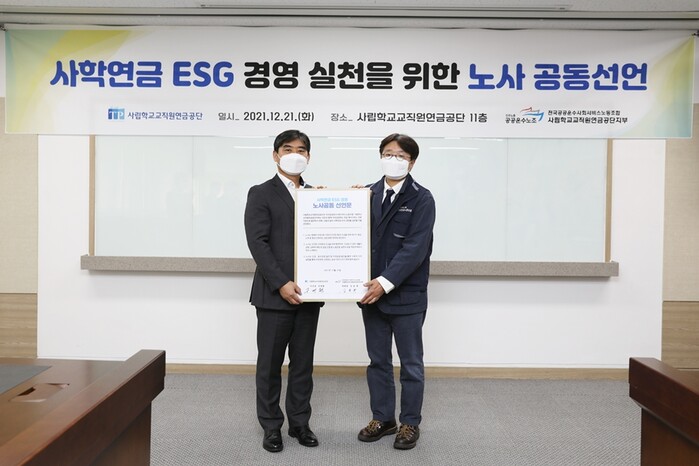 아울러 심동현 노동조합 위원장도 “코로나19 장기화 속에서 어느 때보다 노사가 한마음으로 협력할 때”라며 “다양한 노사 공동 활동을 통해 ESG 경영에 적극 동참하여 노동존중 실현과 사학연금의 지속가능한 발전을 위해 힘쓰겠다”고 말했다.