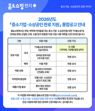 [메가경제=심영범 기자]홈앤쇼핑이 판로 개척에 어려움을 겪는 중소기업과 소상공인을 대상으로 2026년도 판로지원 사업을 대폭 확대한다. 홈앤쇼핑은 ‘2026년도 중소기업·소상공인 판로지원 통합 공고’를 사전 안내하고, TV홈쇼핑과 모바일, 해외 수출을 연계한 맞춤형 지원에 나선다고 26일 밝혔다. 이번 사업을 통해 선정된 상품은 연내 홈앤쇼핑 TV홈쇼핑