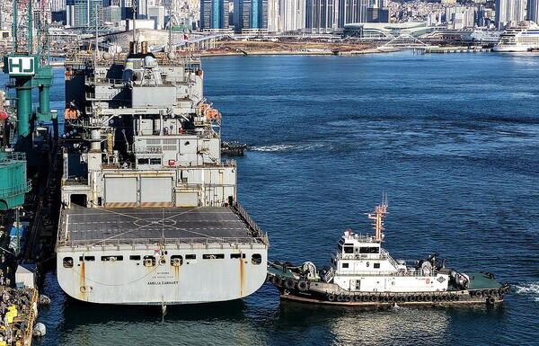 ▲미 해군 함정이 HJ중공업 영도조선소에 입항한 모습[사진=HJ중공업]