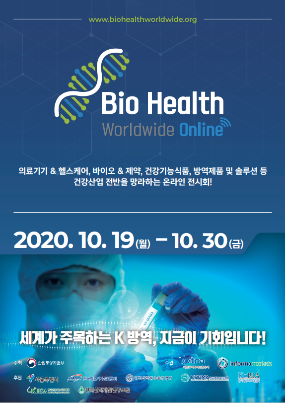 산업통상자원부가 주최하고 한국무역투자진흥공사와 인포마마켓이 주관하는 이 온라인 전시회는 국내 바이오헬스 산업의 해외진출 저변을 확대하기 위해 기획됐으며, 국내 436개와 해외 12개 등 국내외 기업 448개사가 참가했다.