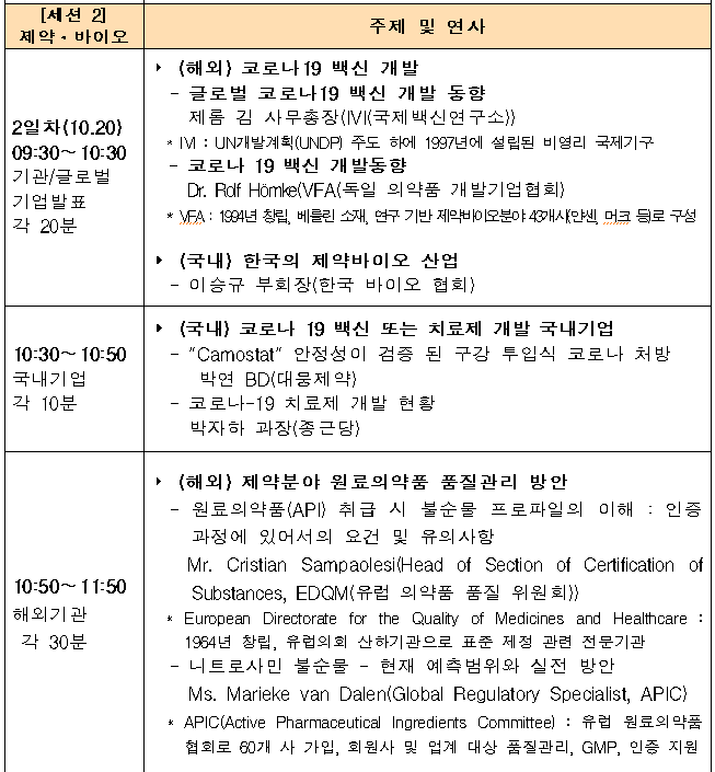 ▲ 20일 열릴 온라인 컨퍼런스 프로그램 '세션2'의 '제약ㆍ바이오' 주제 및 연사. [출처= 산업통상자원부] |