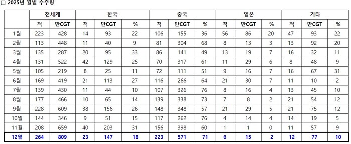 7일 영국 조선·해운 시황 전문기관 클락슨리서치에 따르면 2025년 12월 전 세계 선박 수주량은 809만CGT(264척)로 집계됐다.