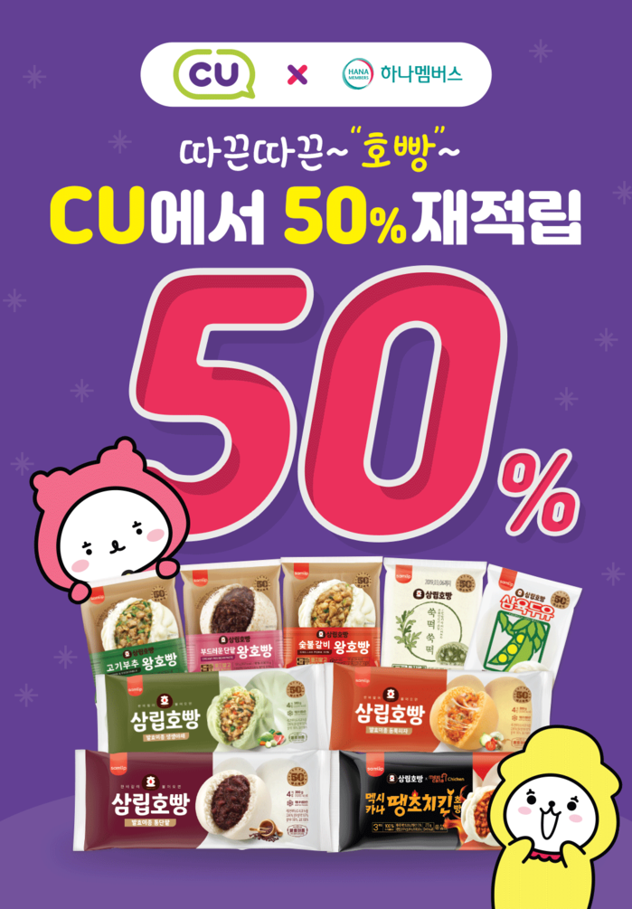 11월 한달 간 ‘하나머니 체크카드’로 CU에서 호빵을 구매하는 손님께 상품 종류에 관계없이 결제액의 50%를 1인당 최대 5000 ‘하나머니’까지 재적립 해준다.