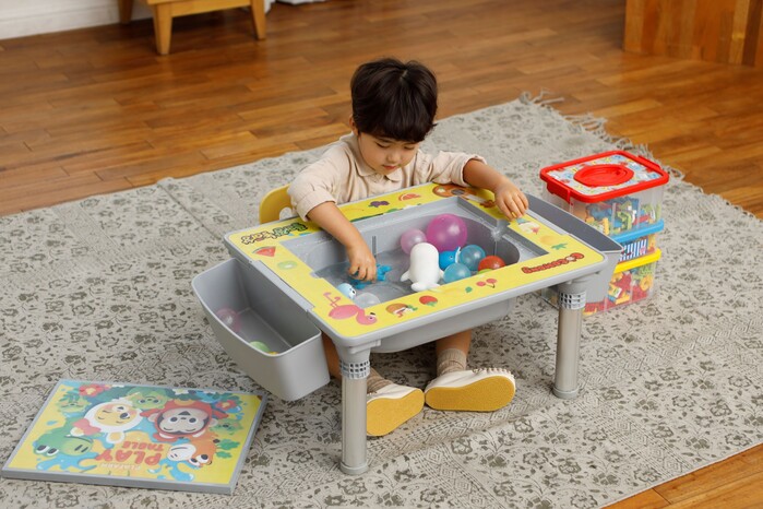 책상과 수납장의 기능을 모두 갖추고 있으며 모래놀이, 점토놀이, 그림 그리기 등이 가능하고 블록을 가지고 놀 수 있는 레고 테이블의 기능까지 갖추고 있다.