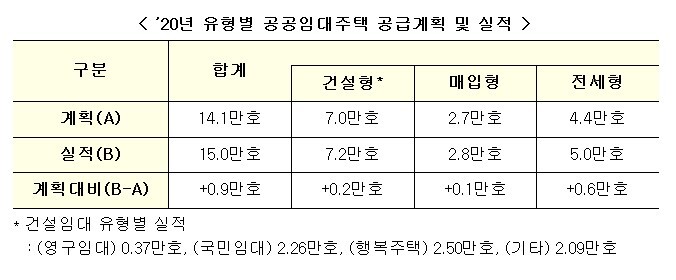 국토교통부(장관 변창흠)는 지난해 공공임대주택 공급 실적을 집계한 결과 당초 공급계획인 14만 1000호보다 9천호 많은 15만호를 공급했다고 2일 밝혔다.