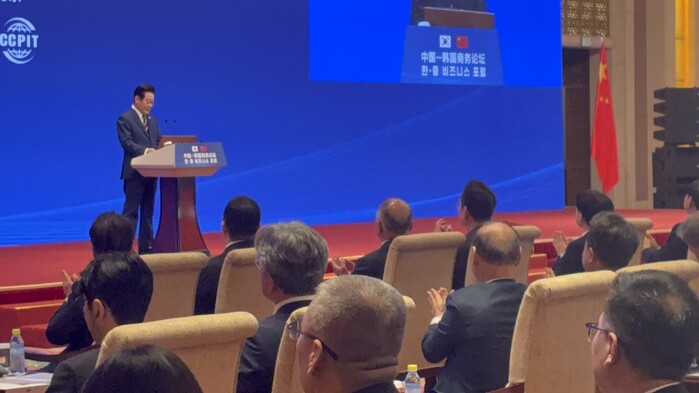 | ▲ 지난 5일 이재명 대통령의 방중 기간 열린 한·중 비즈니스 포럼에서 이대통령이 발언하는 가운데 최병오 패션그룹형지 회장(무대로부터 두 번째줄 우측 두 번째)이 박수를 치며 호응하고 있다. [사진=형지] |
