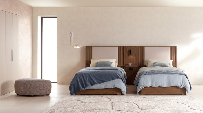 ‘노벨라’는 베이지 톤의 패브릭 헤드보드 쿠션과 고급스러운 월넛 컬러의 템바보드가 조화를 이루며 모던하면서도 따뜻한 무드를 연출한다. 중앙 패브릭 쿠션을 중심으로 균형 있게 펼쳐지는 템바보드 라인이 침실 전체에 세련된 안정감을 주며, 규칙적인 패턴이 만들어내는 입체감은 럭셔리 호텔을 연상시키는 고급스러운 공간 경험을 제공한다.