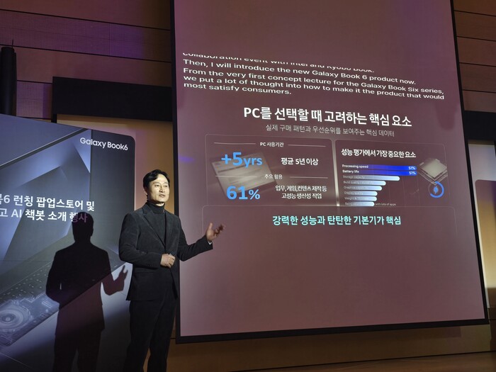 이 부사장은 “갤럭시 북6 시리즈는 내부 설계뿐 아니라 외부 디자인까지 새롭게 구성한 역대 가장 강력한 제품”이라며 “성능 중심의 최고 수준 엔지니어링 기준을 적용했고, 갤럭시 생태계 확장을 위한 준비도 함께 진행했다”고 밝혔다. 이어 “갤럭시 AI와 멀티 디바이스 경험을 제공하기 위해 갤럭시 에코시스템 역시 준비하고 있다”고 말했다.