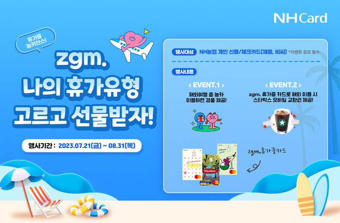 또한 ‘zgm.휴가중(지금 휴가중)카드’고객이라면, 행사기간 내 해외 전 가맹점에서 합산 30만원 이용 시 스타벅스 아메리카노 모바일 교환권을 추가로 받을 수 있다. 이벤트 응모 등 기타 자세한 내용은 NH농협카드 홈페이지 및 카드 모바일 앱(스마트앱·NH pay)을 통해 확인할 수 있다.