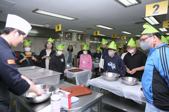 ▲ 치킨대학 치킨캠프에 참여한 특수학교 학생들이 BBQ 황금올리브 치킨 조리방법을 배우고 있다 [사진=BBQ] |