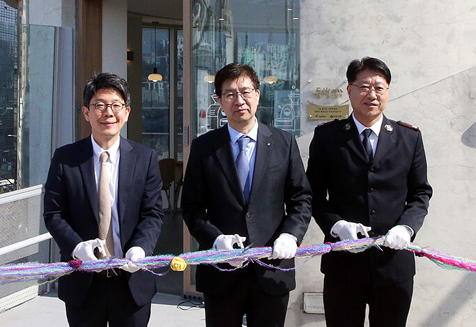 | ▲ 개점식에서 강영홍 신한은행 경영지원그룹장(가운데), 김병민 서울특별시 정무부시장(왼쪽), 장경환 서울노숙인시설협회장(오른쪽) 기념촬영 [사진=신한은행 제공] |