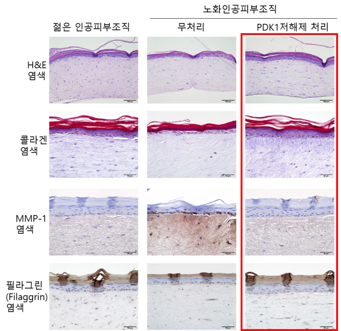 노화된 인공피부모델에서 카이스트 조광현 교수 연구팀이 새롭게 발견한 핵심 인자(PDK1, 3-Phosphoinositide Dependent Protein Kinase)를 조절한 결과, 감소한 콜라겐 합성이 다시 증가하고 피부 재생 능력이 회복되는 결과를 확인할 수 있었다.