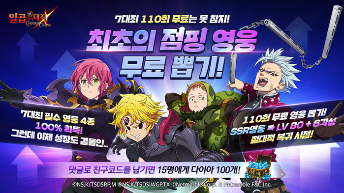 [메가경제=최낙형 기자] 넷마블은 모바일 RPG ‘일곱 개의 대죄: GRAND CROSS(이하 일곱 개의 대죄: 그랜드 크로스, 개발사 넷마블F&C)>에 다양한 혜택을 제공하는 <절대복귀 이벤트>를 실시한다고 20일 밝혔다.
