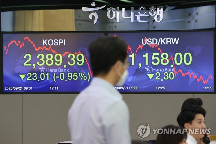 21일 코스피는 전날보다 23.01포인트(0.95%) 내린 2389.39에 장을 마쳤다.