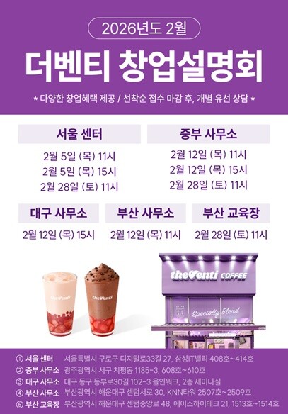 창업설명회에서는 매장 개설 절차, 예상 비용, 운영 시스템 등 실질적인 창업 정보와 함께 더벤티만의 교육 및 점주 상생 프로그램 등 차별화된 정책을 소개할 예정이다.