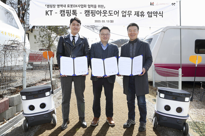 | ▲ KT AI 로봇사업단 이상호 단장(가운데), 캠핑톡 최종석 대표(오른쪽), 캠핑아웃도어 김정환 대표 [사진=KT 제공] |