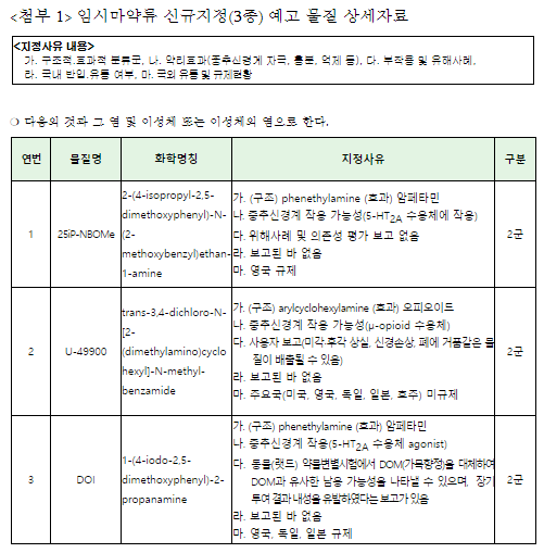 ▲ 임시마약류 신규지정(3종) 예고 물질 상세자료. [출처= 식품의약품안전처] |
