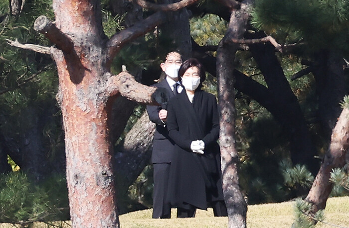 | ▲ 25일 오전 경기도 수원시 선영에서 치러진 고 이건희 삼성그룹 회장 2주기 추모식에 참석한 이재용 삼성전자 부회장과 홍라희 전 삼성미술관 리움 관장 [사진=연합뉴스] |