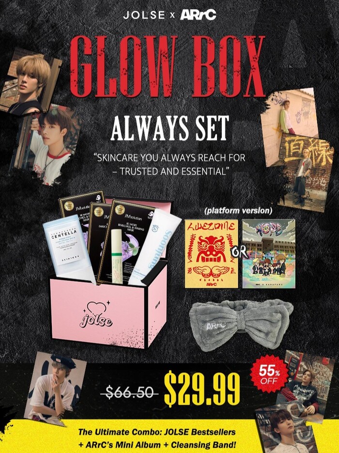 졸스에서 선별한 K뷰티 화장품 4종과 아크 앨범 및 포토북, 굿즈로 구성돼 있다. 글로우 박스 종류는 아크 팀명을 활용해 이름을 지은 ▲올웨이즈 ▲리멤버 ▲리얼 ▲커넥션 세트 총 4종이다.