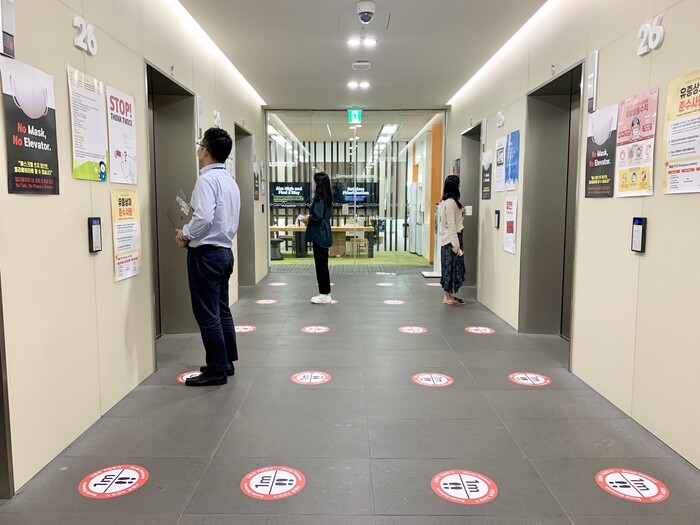 ▲ 쿠팡은 잠실 본사 건물 내 직원간 초고강도 거리두기를 시행하고 있다. [사진= 쿠팡 제공] |