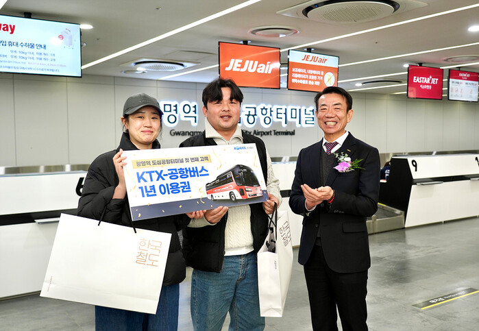 한문희 사장은 이날 도심공항 첫 이용객인 유근영, 김태현 씨(전북 남원) 부부에게 ‘광명역 KTX-공항버스’ 1년 무료 이용권과 기념품을 증정하며 환영했다.