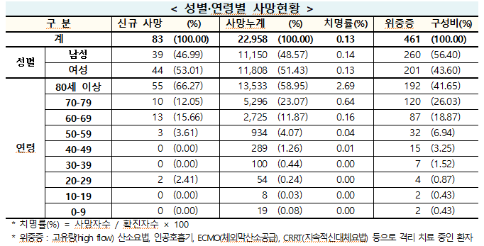 누적 사망자는 2만2958명, 누적 치명률은 0.13%이다.