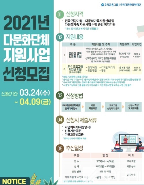신청자격은 전국 건강가정, 다문화가족지원센터와 다문화 복지사업을 진행하고 있는 복지기관이며, 다음달 9일까지 우리다문화장학재단 홈페이지에서 ‘기관회원’으로 온라인 신청서 작성 및 사업계획서를 제출하면 된다.